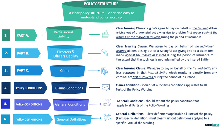 Please see our graphic overleaf on Product Structure. The general definitions need to align with the whole wording, be well drafted (to be clear and easy to understand), with part-specific definitions being well drafted.