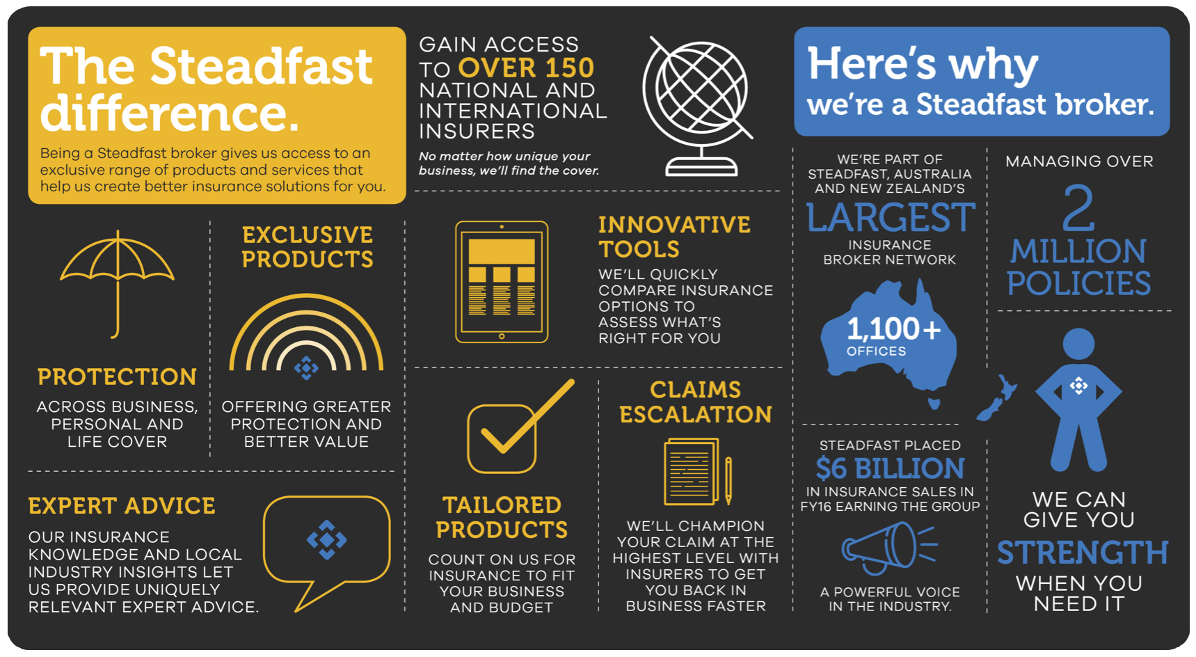 With over 343 brokerages spread across more than 1,100 offices, the Steadfast Group generated over $6 billion in insurance sales in FY16. This scale gives Steadfast the ability to negotiate and work with major insurers on behalf of Steadfast brokers and results in us being able to provide you with access to multiple insurance companies, a broad range of exclusive products and services combined with our local, expert advice.