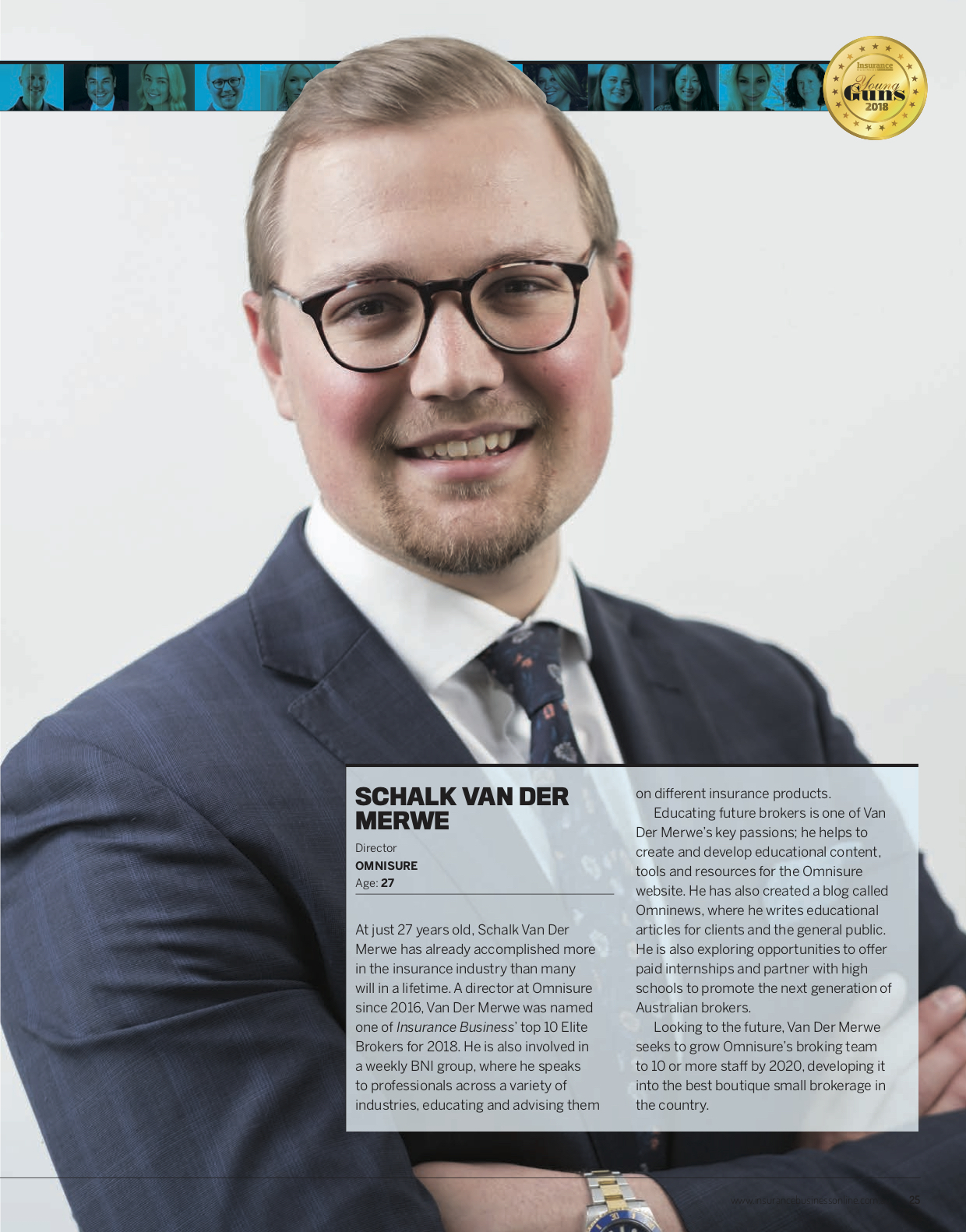 Each year, Insurance Business Magazine recognises 35 young professionals making their mark on Australia’s insurance industry. Deemed to become the industry’s most promising future leaders, it is a huge honour for Schalk to be named as a rising star amongst the impressive talent pool of insurance brokers, underwriters, business development managers and sales managers.